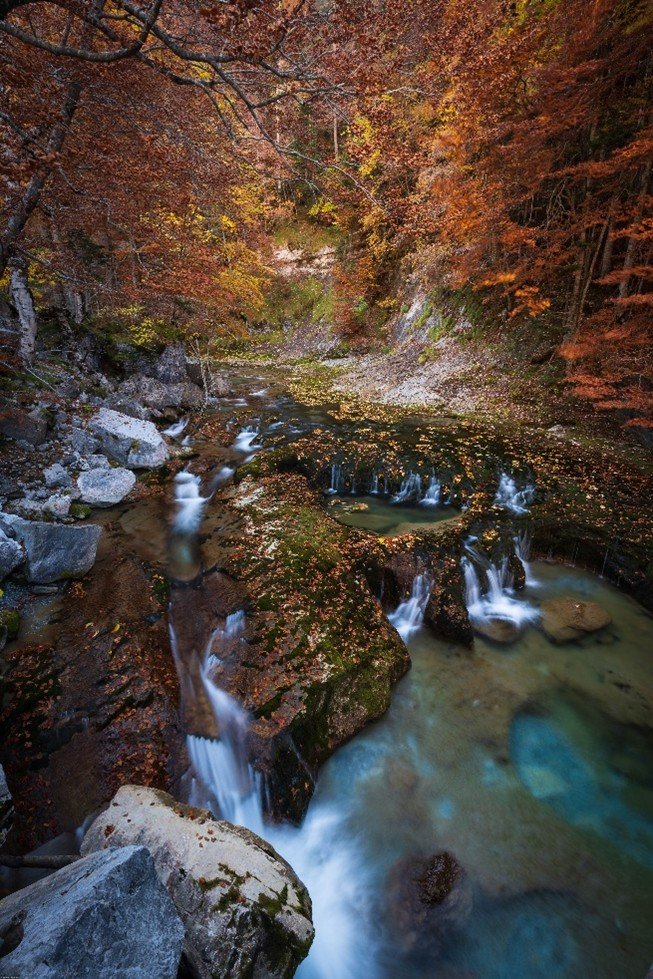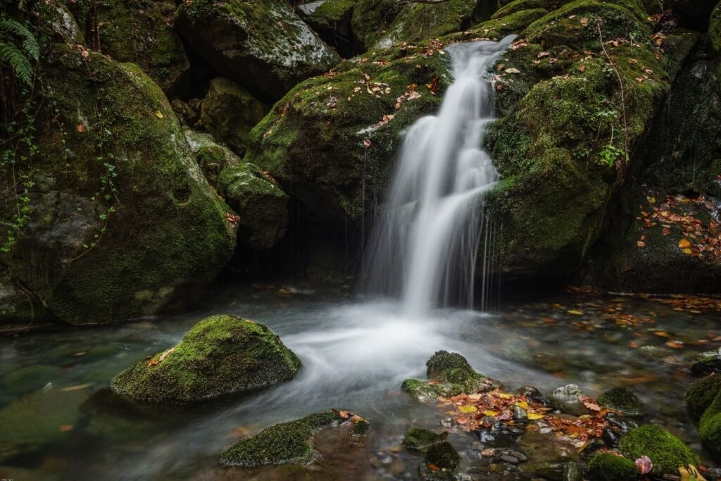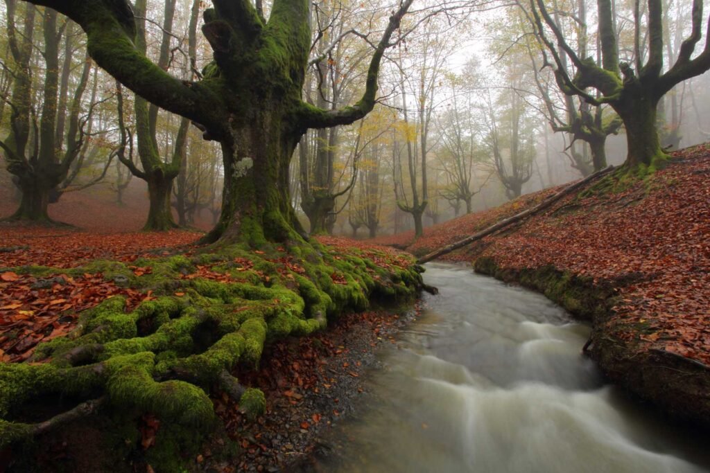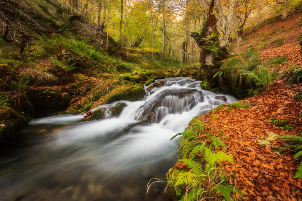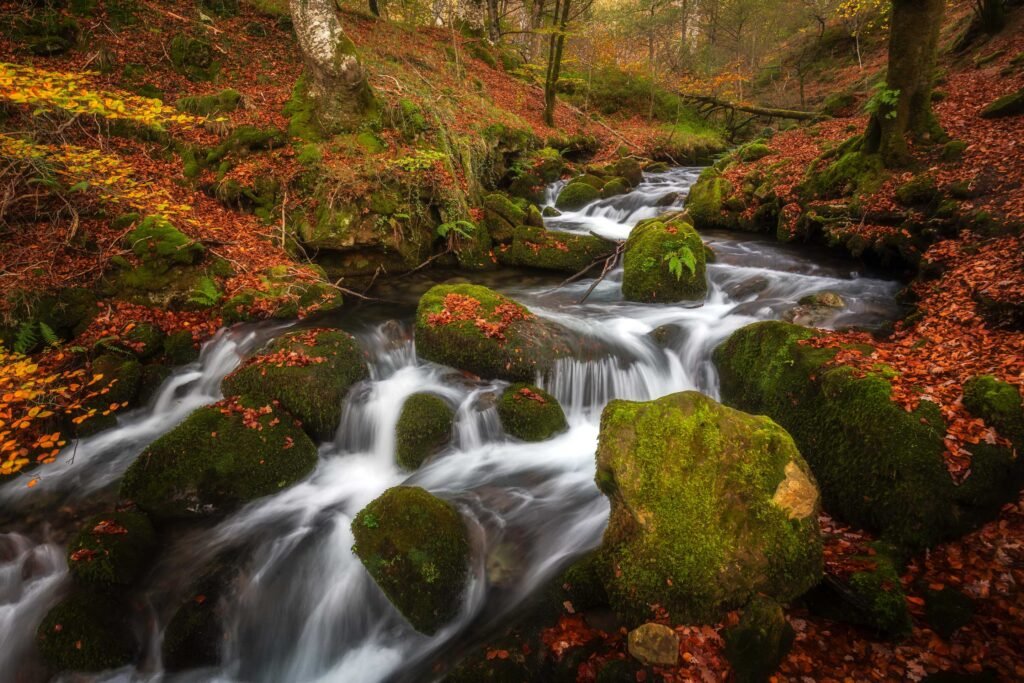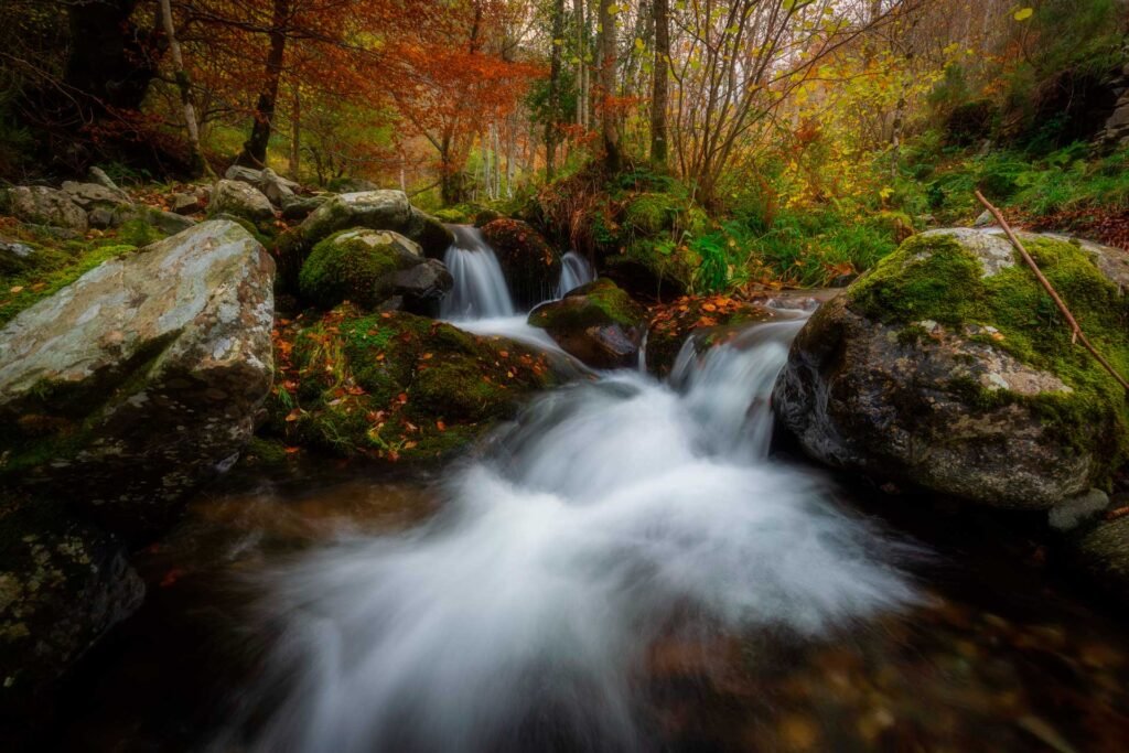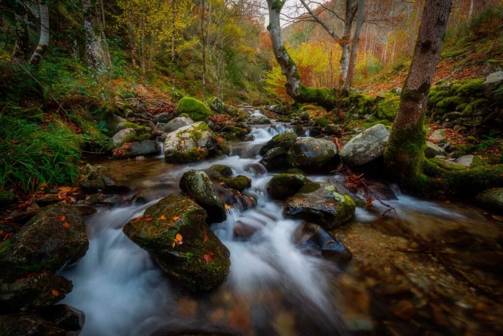 El agua es un elemento que nos va a ayudar en la composición. Si por el bosque pasa un arroyo utilízalo. Busca un tiempo de exposición de entre 0.5 y 4 segundos y obtén una bonita imagen con agua sedosa rodeada de los colores del otoño.